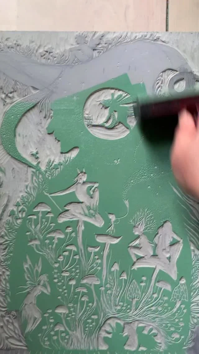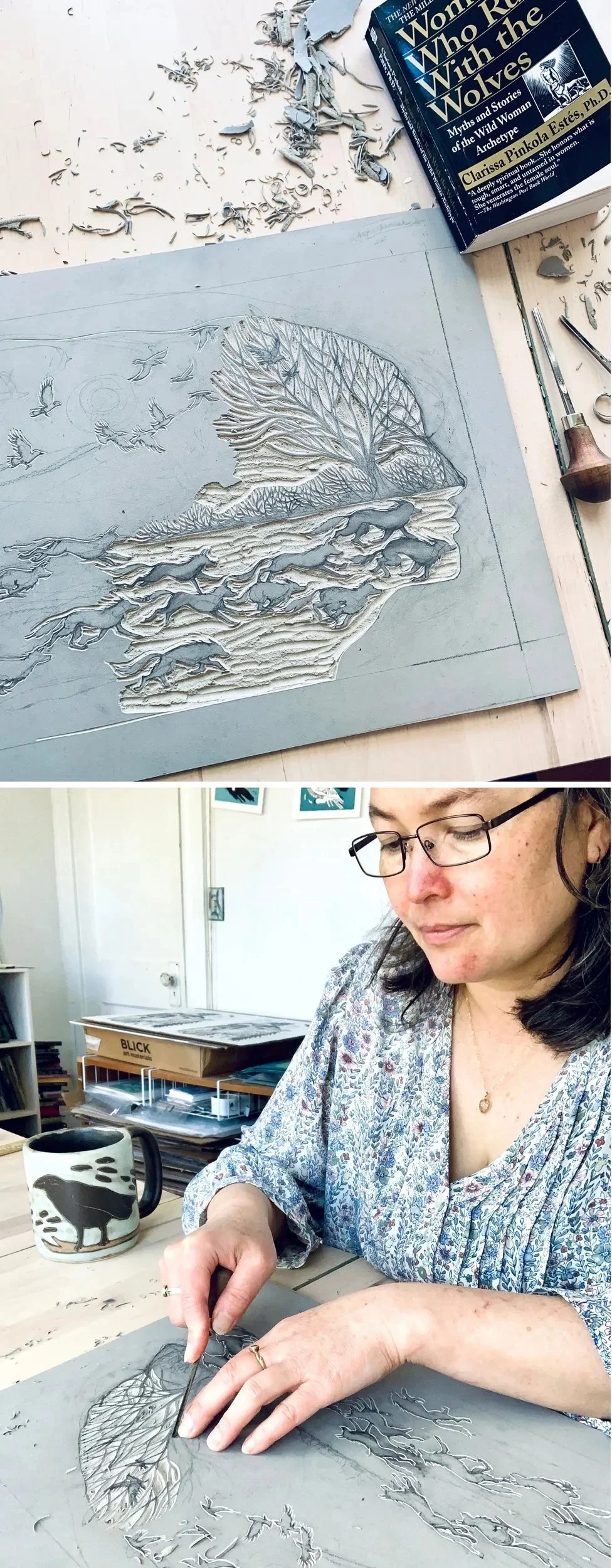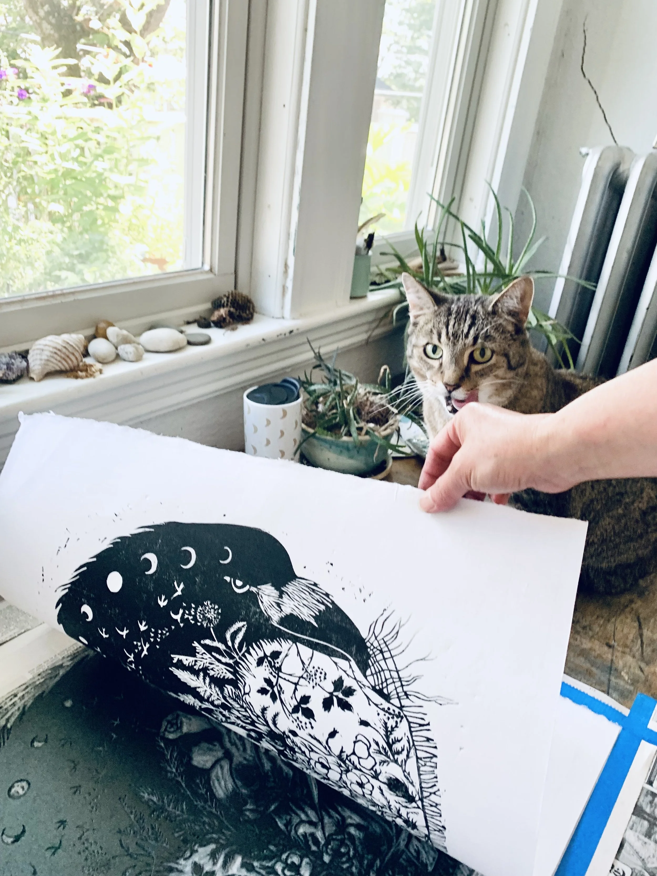 I carve and print with care, using natural materials and time-honored block printing techniques that echo the timelessness of the folktales that inspire them. My work is where craft and story meet — one shaped by ink and the slow rhythm of hand and blade, the other carried through generations by voice and memory. Both are vessels of folk-wisdom: one drawn from the raw elements of the earth, the other from the deep forest of the imagination. Together, they offer a path — a way of weaving us back into kinship with the wild.