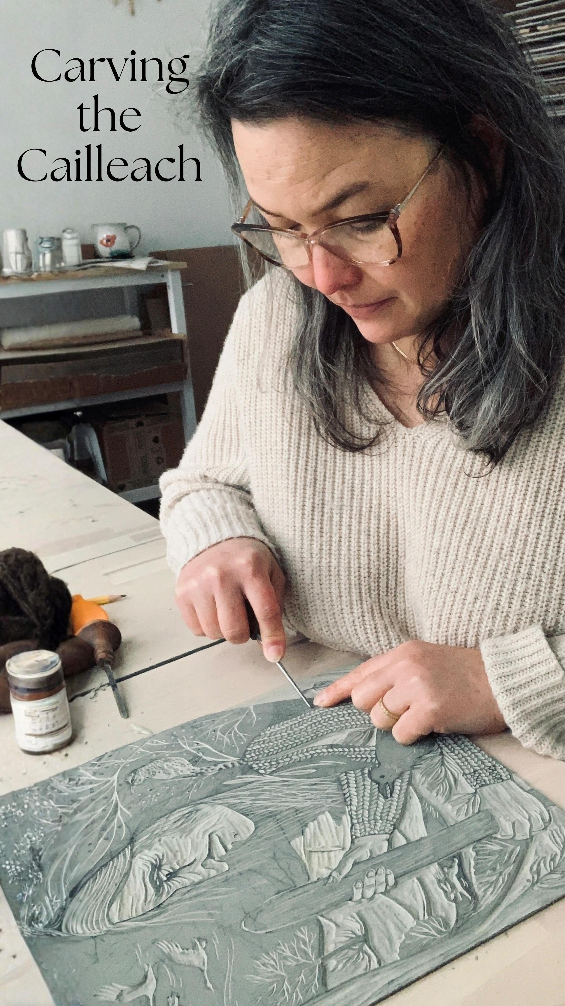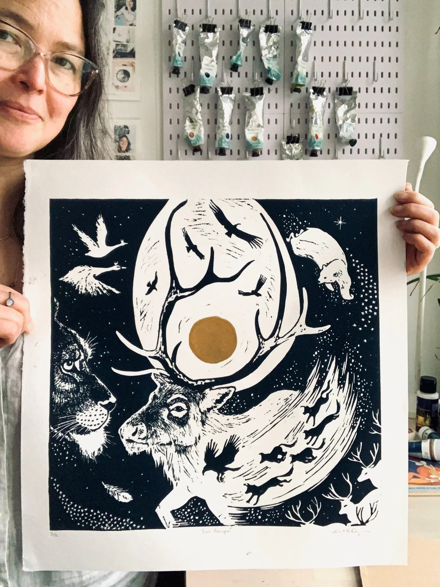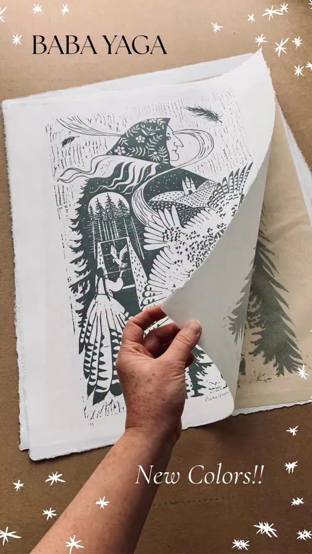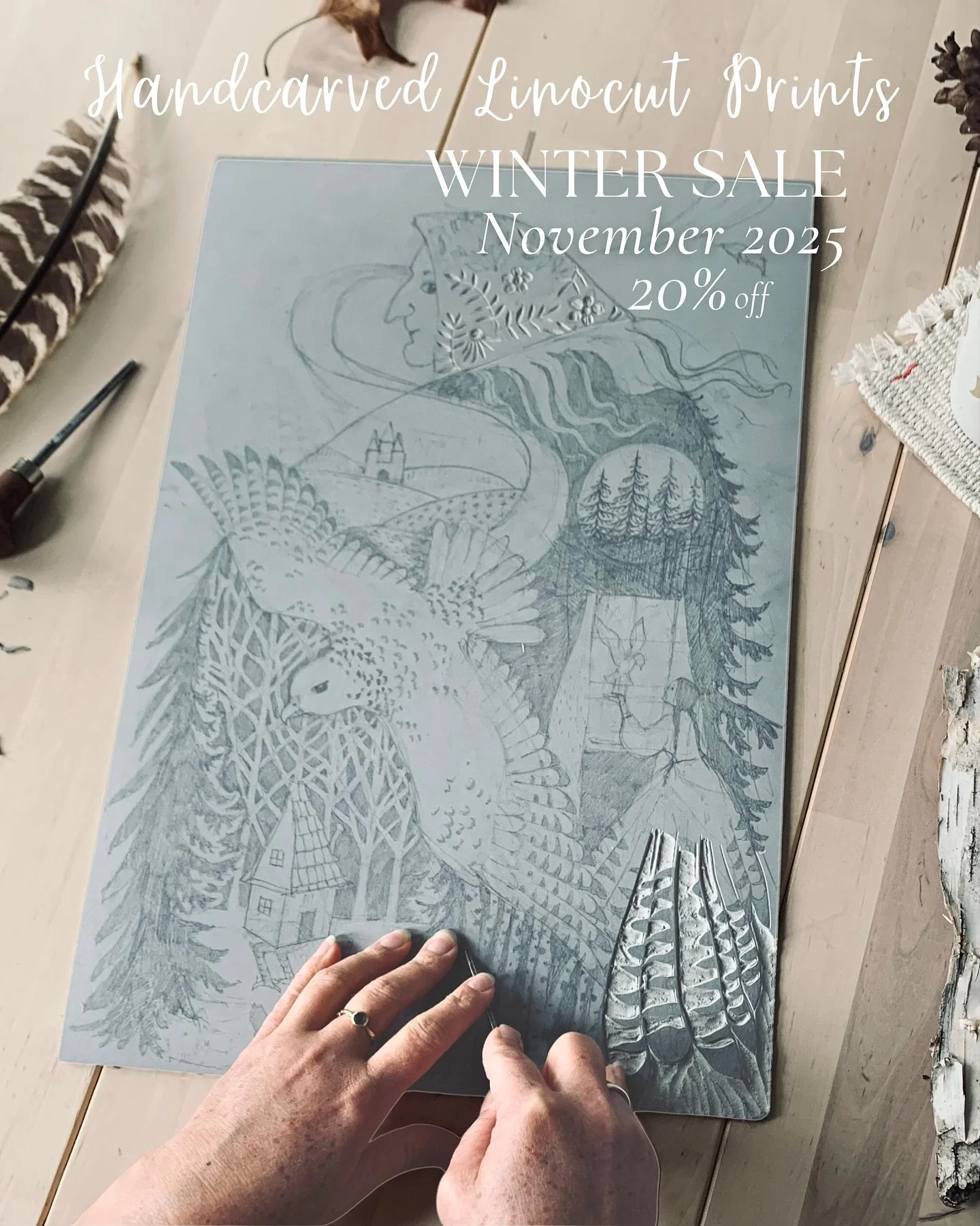 I carve and print with care, using natural materials and time-honored block printing techniques that echo the timelessness of the folktales that inspire them. My work is where craft and story meet — one shaped by ink and the slow rhythm of hand and blade, the other carried through generations by voice and memory. Both are vessels of folk-wisdom: one drawn from the raw elements of the earth, the other from the deep forest of the imagination. Together, they offer a path — a way of weaving us back into kinship with the wild.