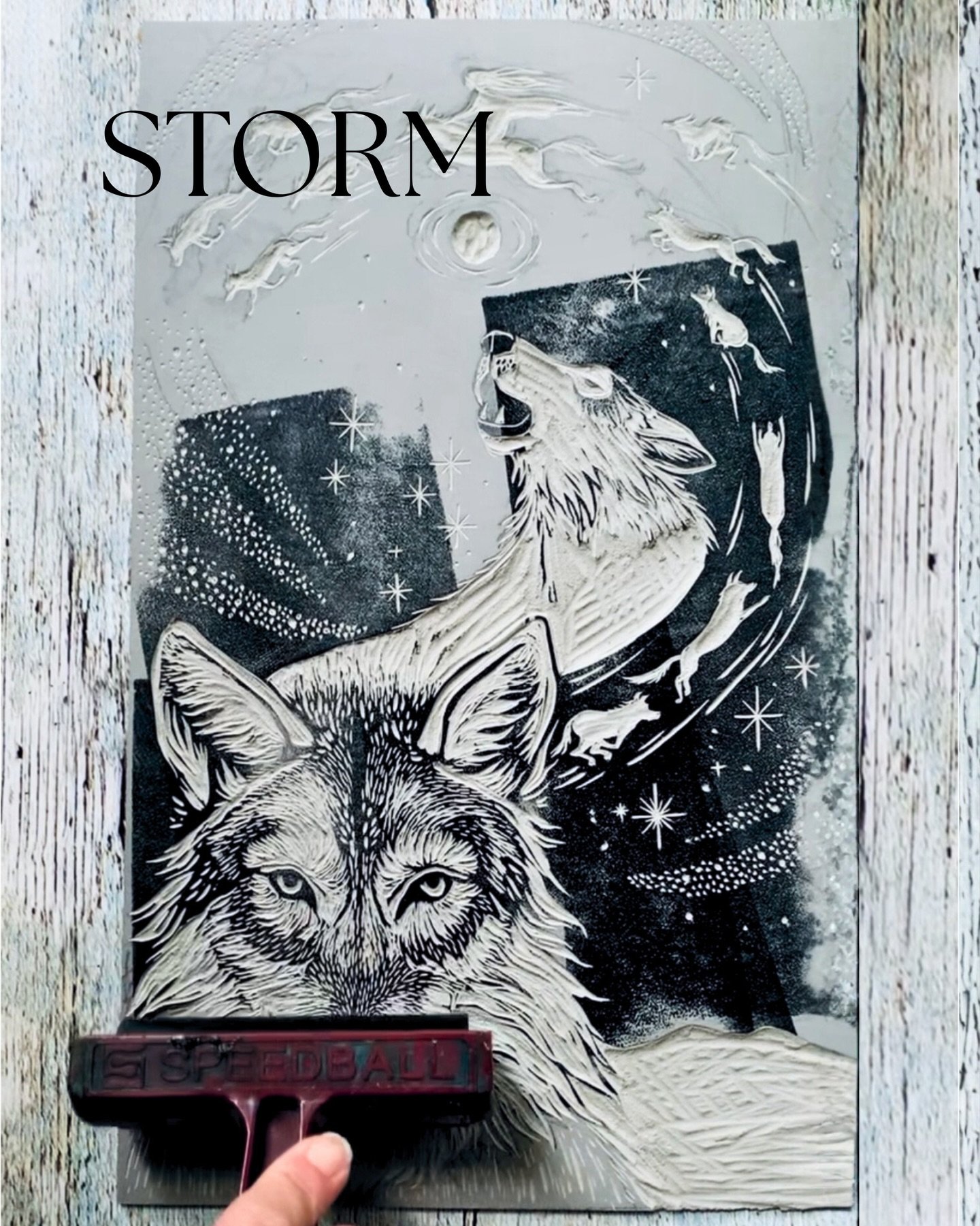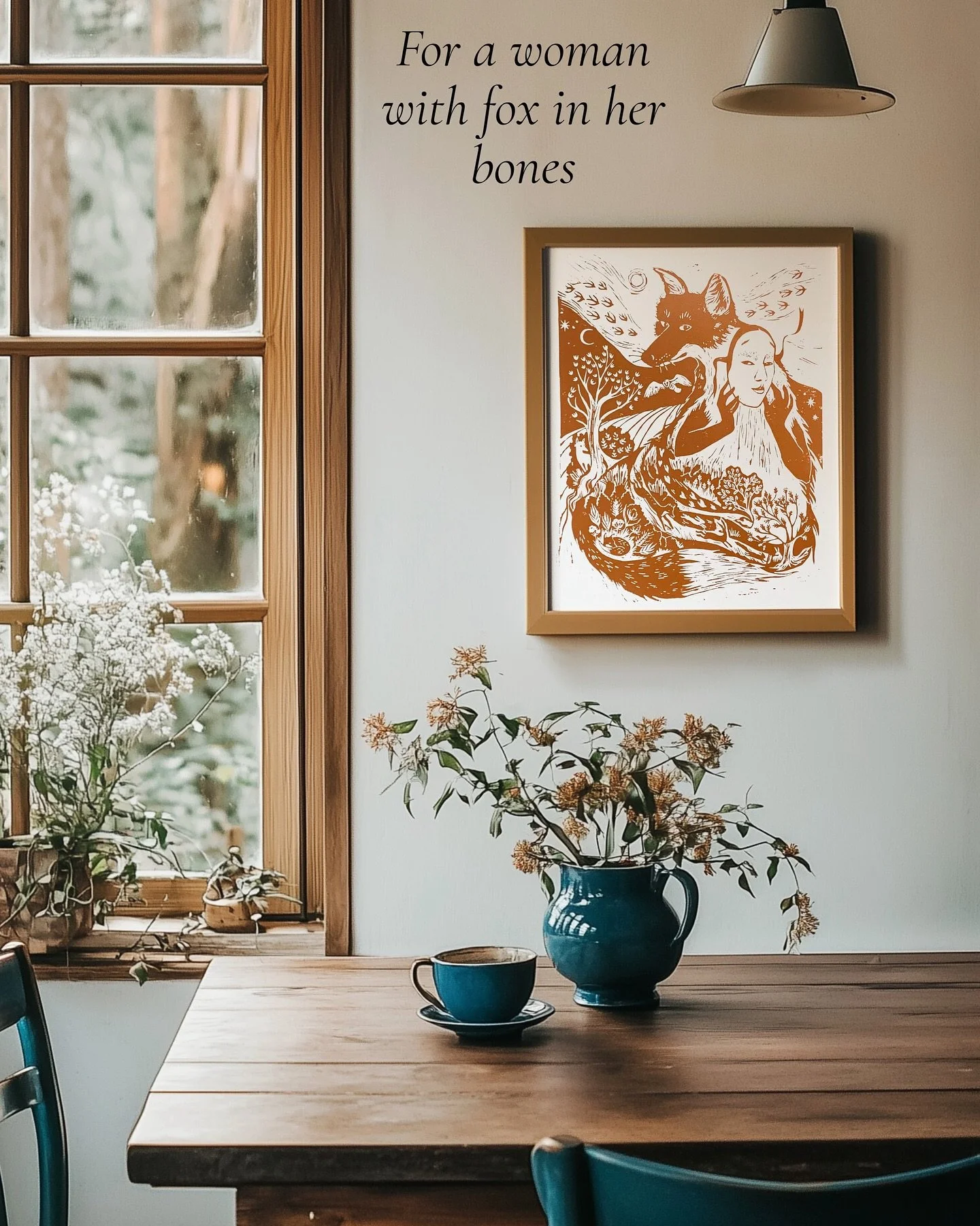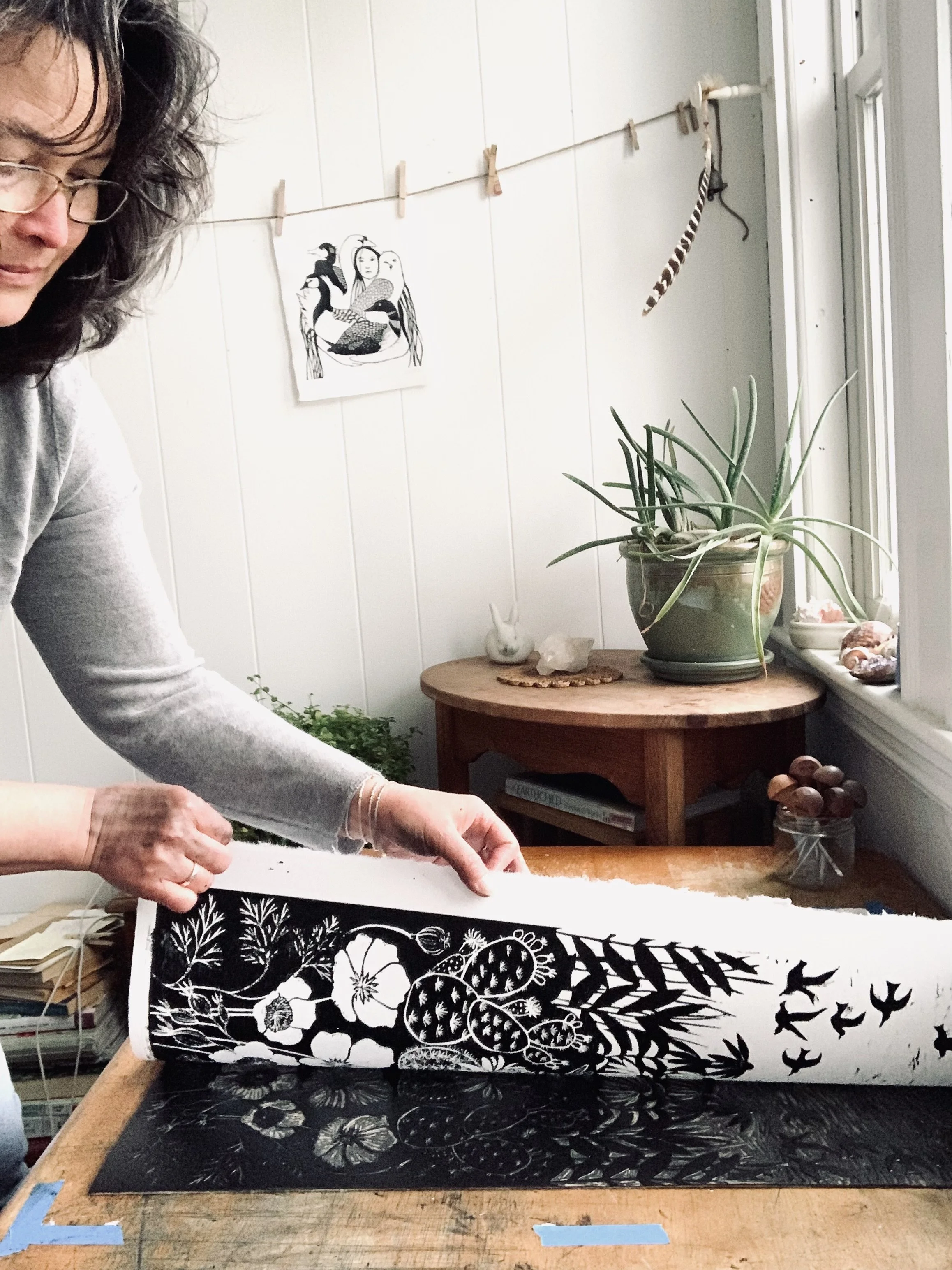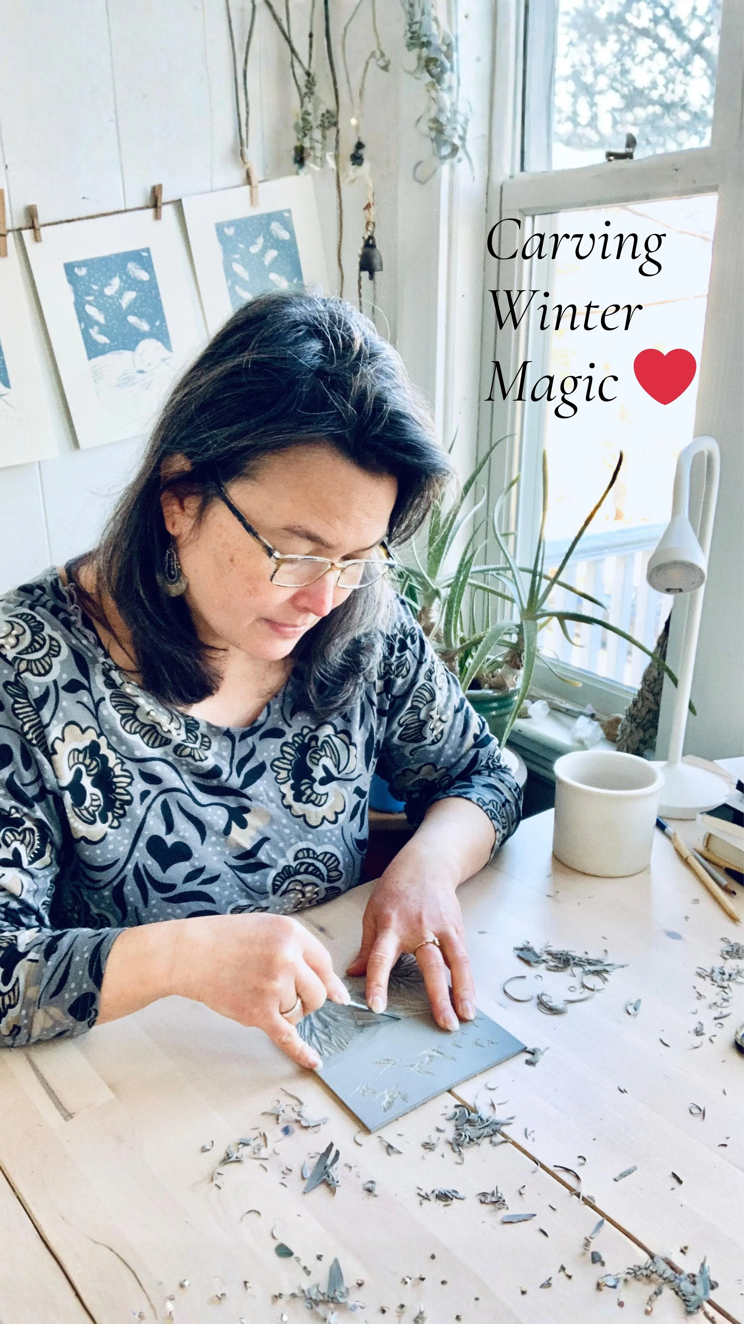 I carve and print with care, using natural materials and time-honored block printing techniques that echo the timelessness of the folktales that inspire them. My work is where craft and story meet — one shaped by ink and the slow rhythm of hand and blade, the other carried through generations by voice and memory. Both are vessels of folk-wisdom: one drawn from the raw elements of the earth, the other from the deep forest of the imagination. Together, they offer a path — a way of weaving us back into kinship with the wild.