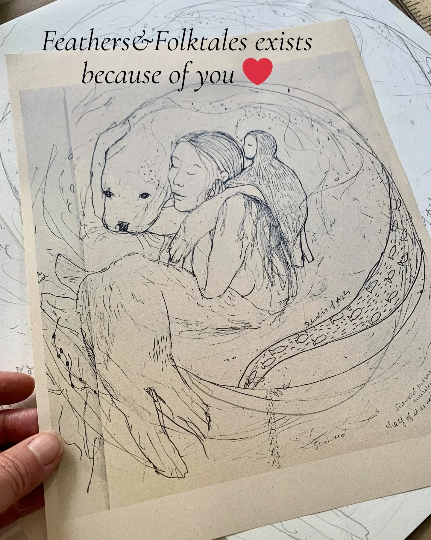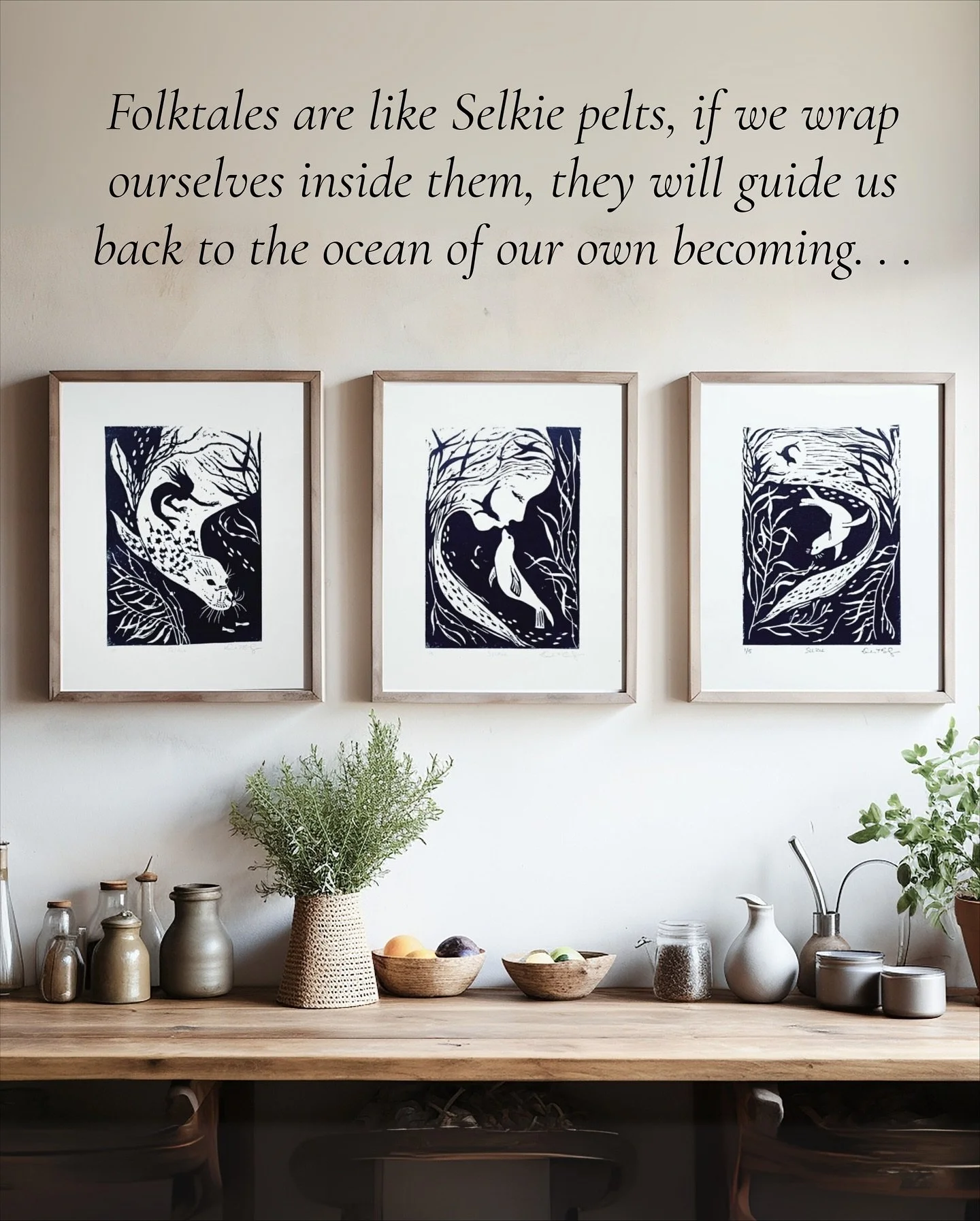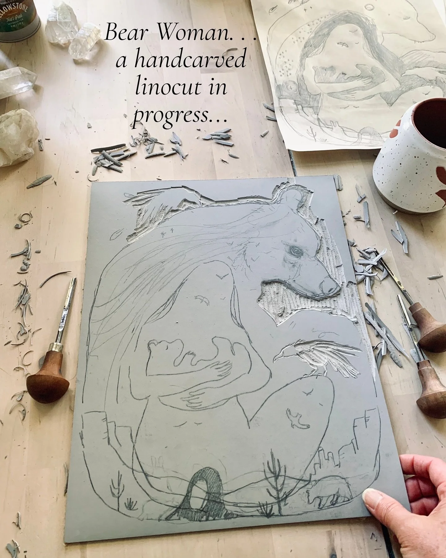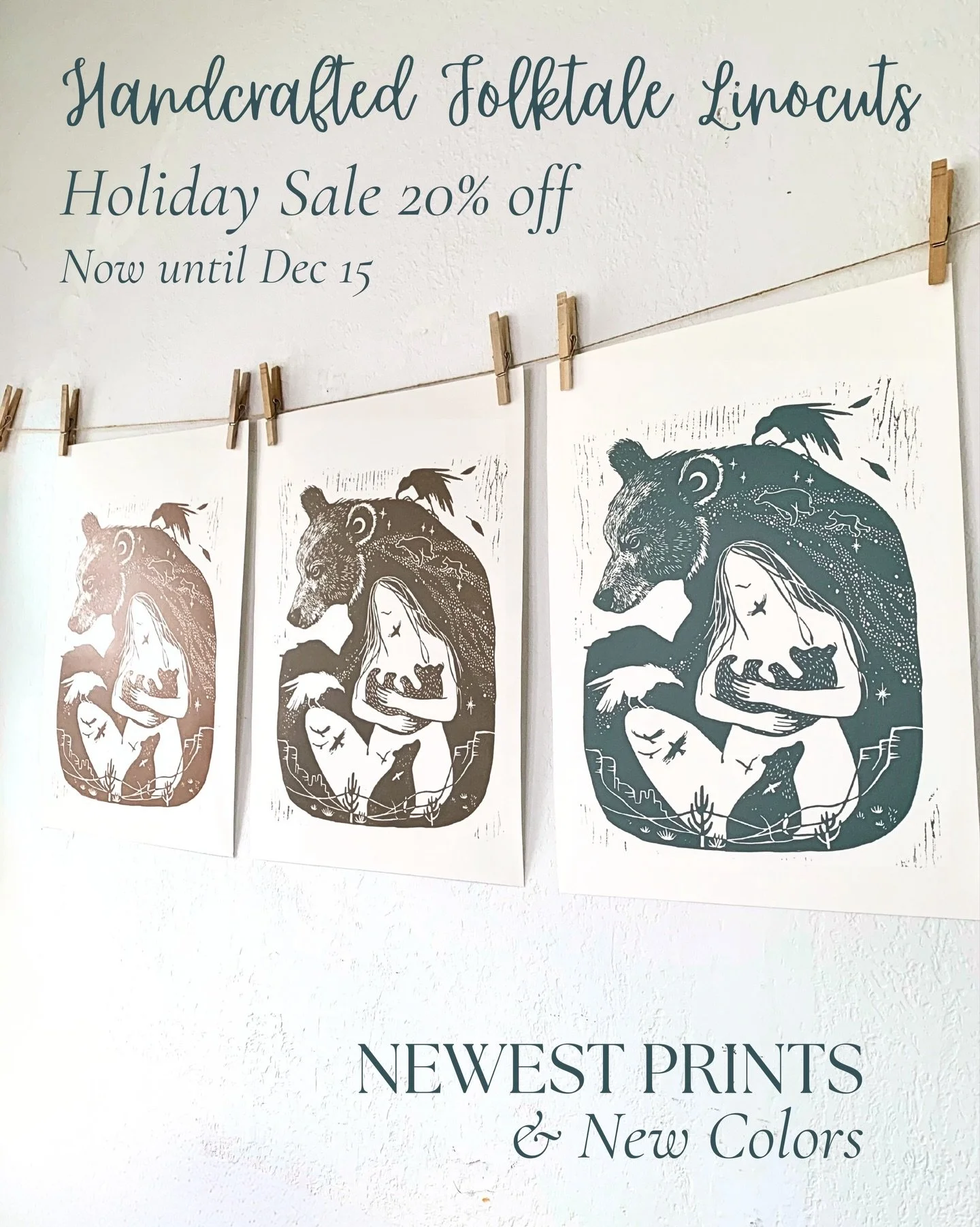 My name is Diem Dangers and I am an artist and folklorist committed to preserving and reviving the living spirit of folklore through my handcrafted linocut art rooted in reverence for the wild feminine and cultural mythologies. My artwork and my writing is inspired by my passion for folktales from around the world that are woven together through their shared honoring of women who nurture, steward, and live in intimacy with the wild or who are creaturely themselves.