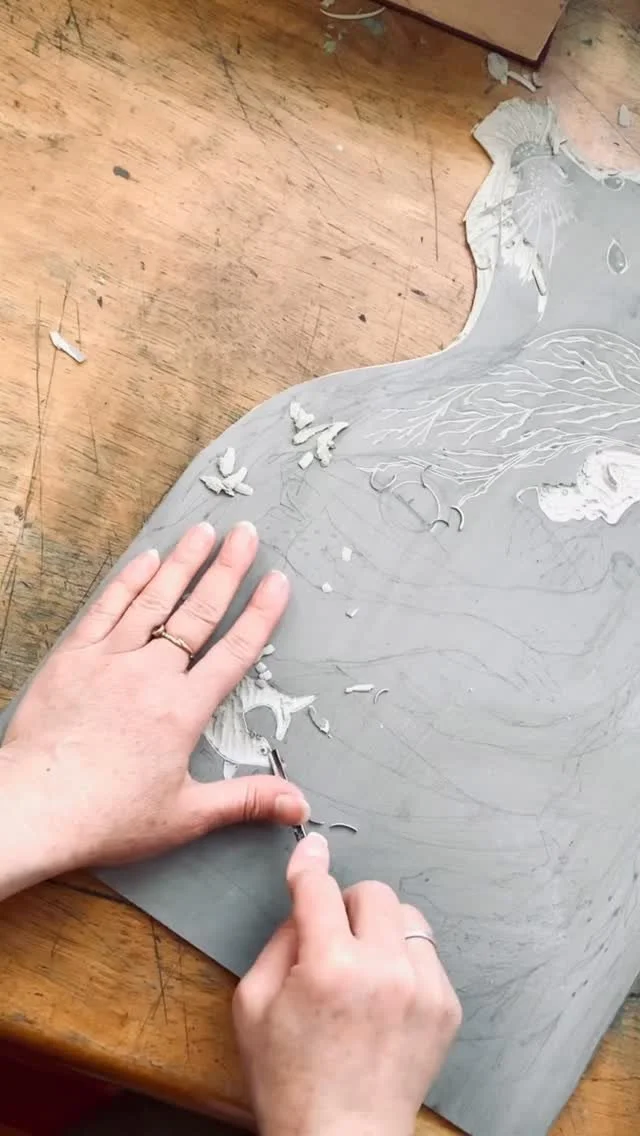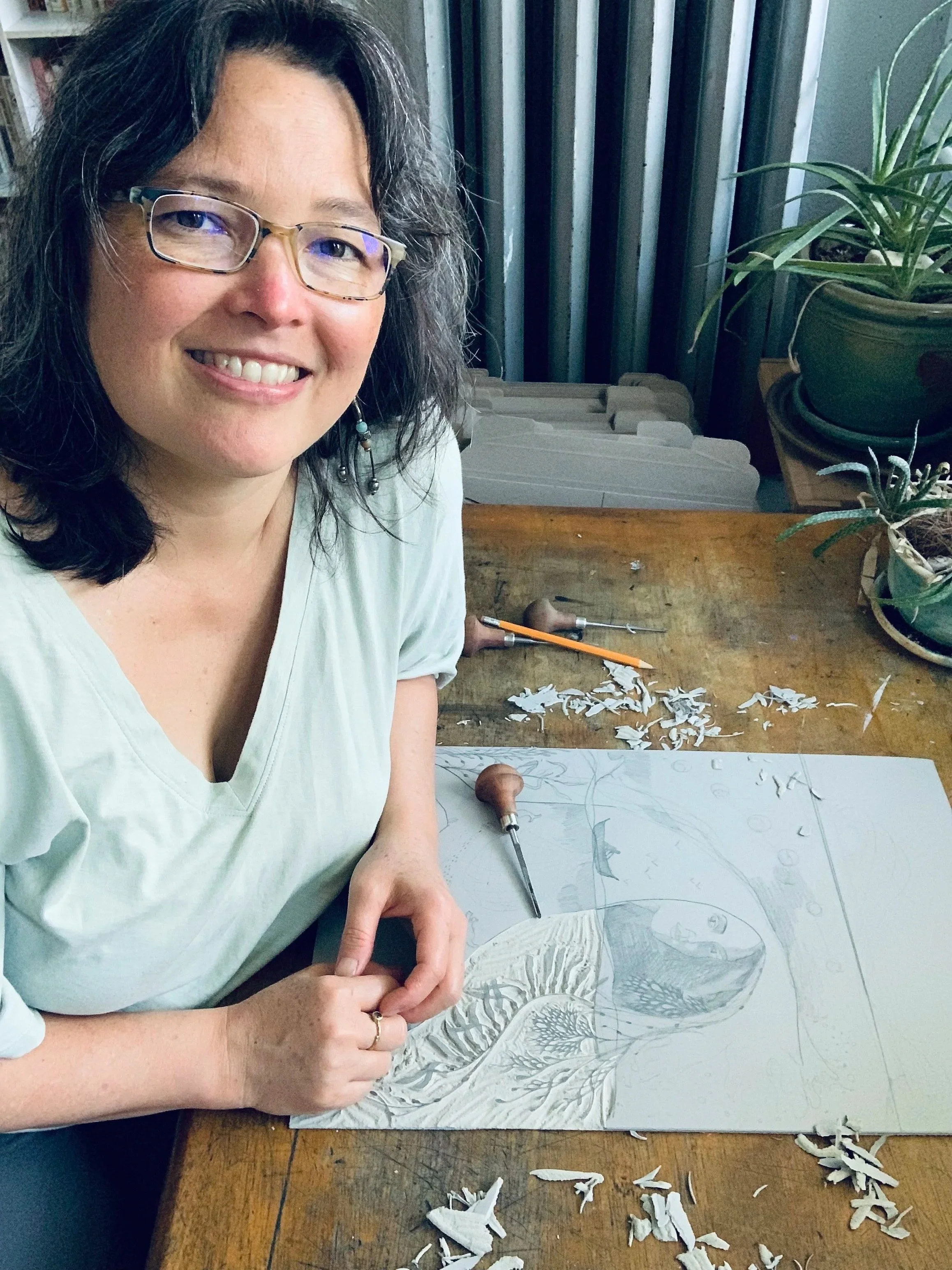 My inspiration to begin printmaking came from discovering the Đông Hồ folk art block prints depicting the natural environment and folktales from my mother’s native Vietnam. Given that I am a self-taught visual artist with a background in anthropology and a personal interest in folklore, finding these prints felt like uncovering a bridge between art, culture, and ancestral story. I find it deeply meaningful to be carrying on the age-old technique of hand-carving and hand-printing, an artistic legacy with roots in the East, that follows a cross-cultural cross-continental journey to the West through history that is somewhat parallel to my own life trajectory. I have lived in several countries in the Asia-Pacific region, all of which has nurtured my interest and love for folktales from a diverse variety of cultures and landscapes.