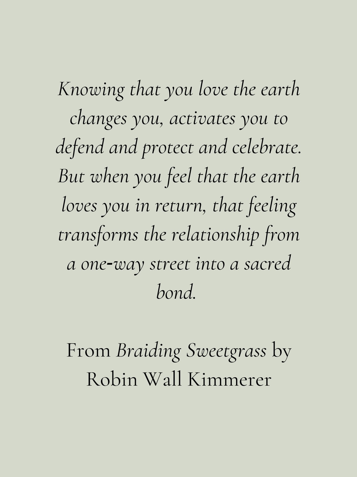 Kimmerer, R. W. (2013). Braiding sweetgrass: Indigenous wisdom, scientific knowledge, and the teachings of plants. Milkweed Editions.