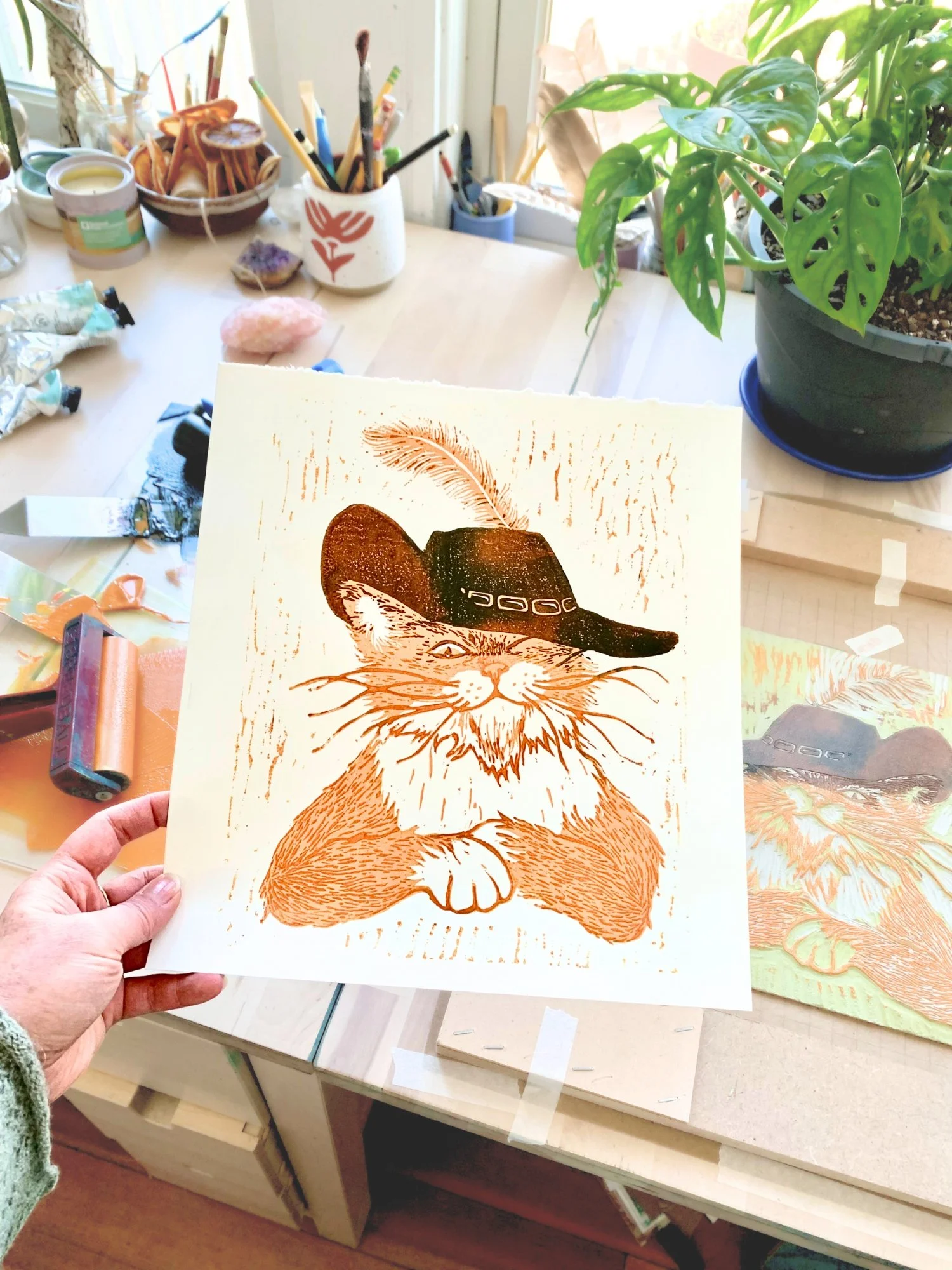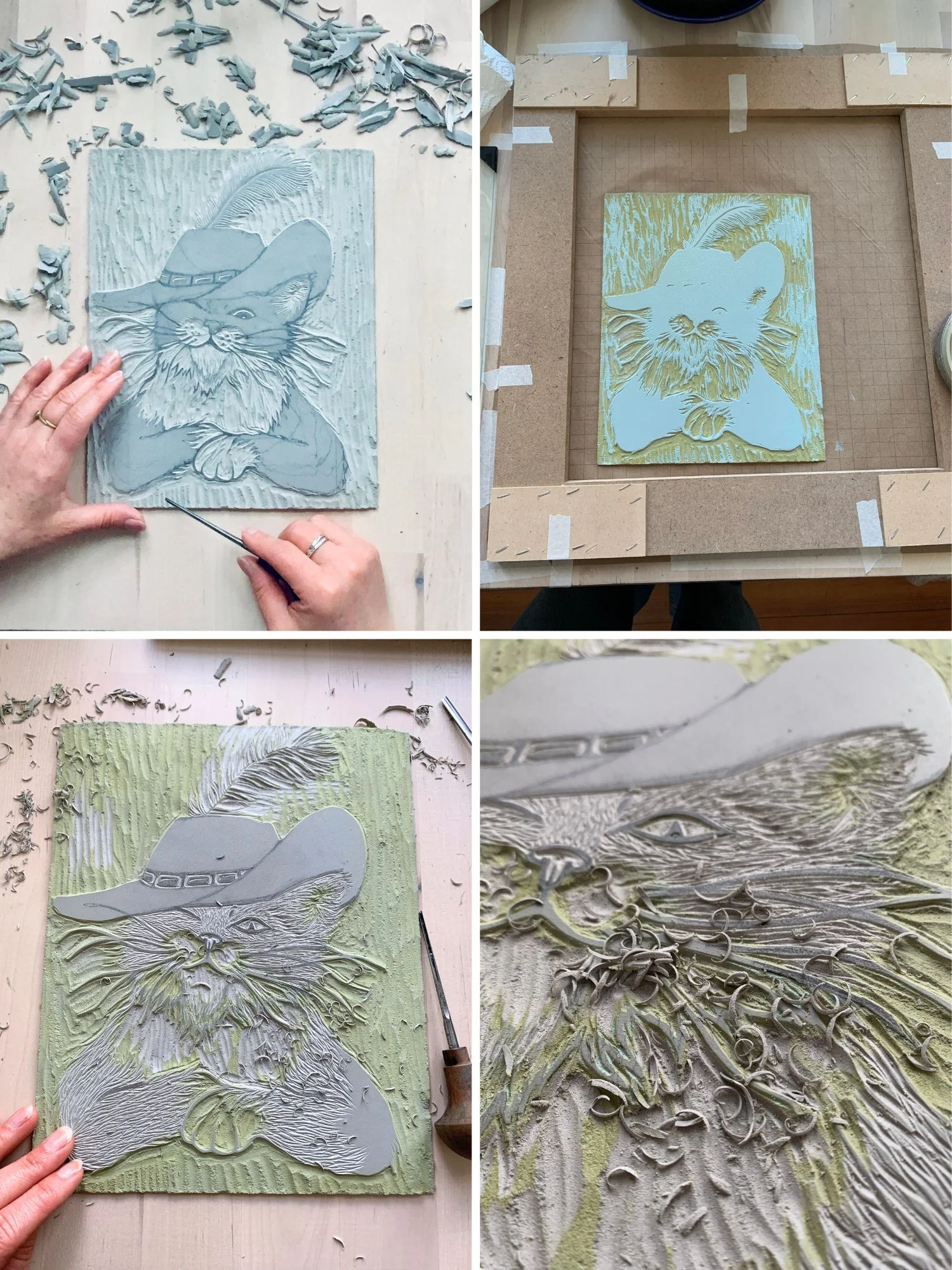 These series of photos show the process of creating a reduction linocut. Top two photos: A block of linoleum is carved to make a first print. Bottom two photos: Then the same block is carved more to print on top of the first.