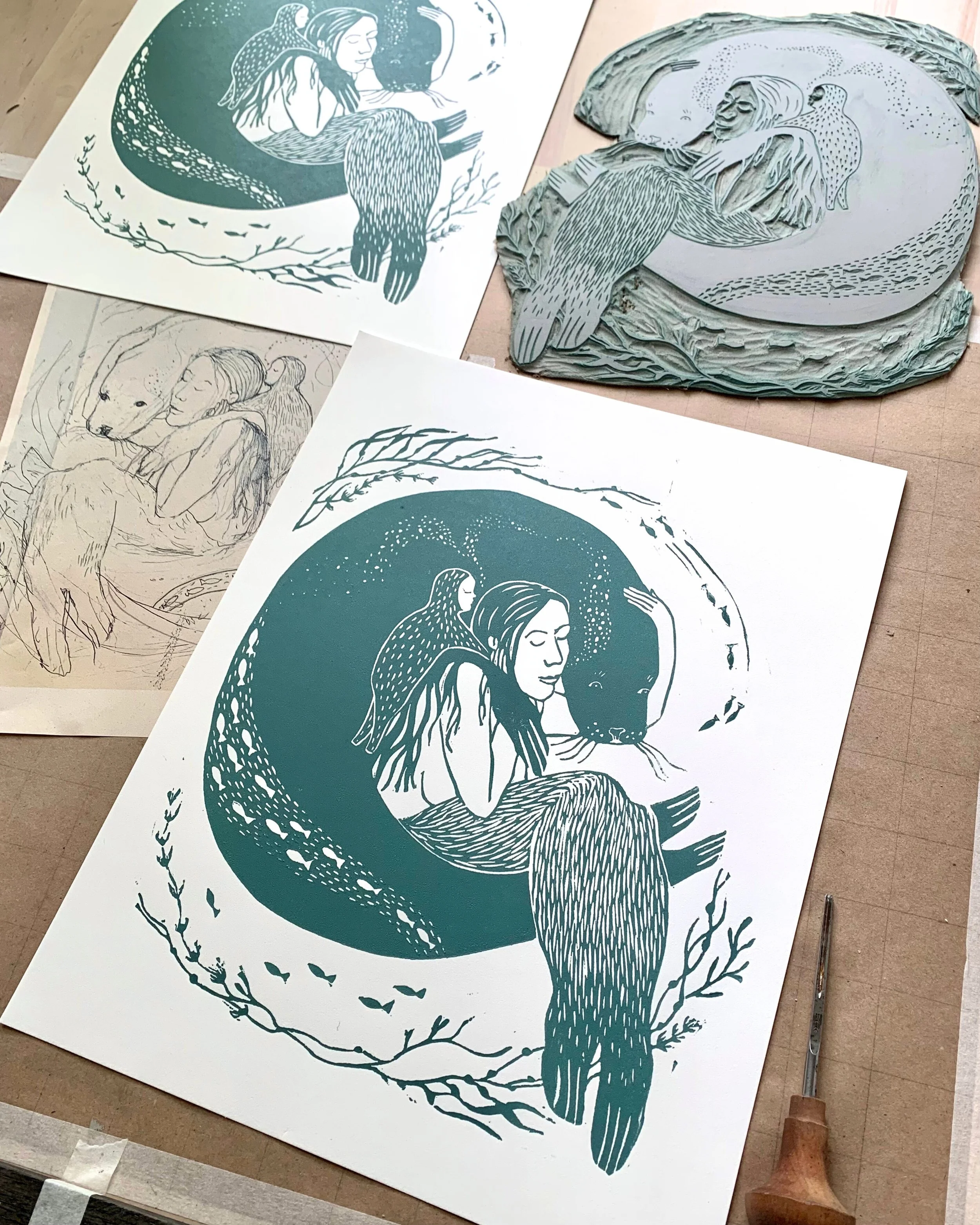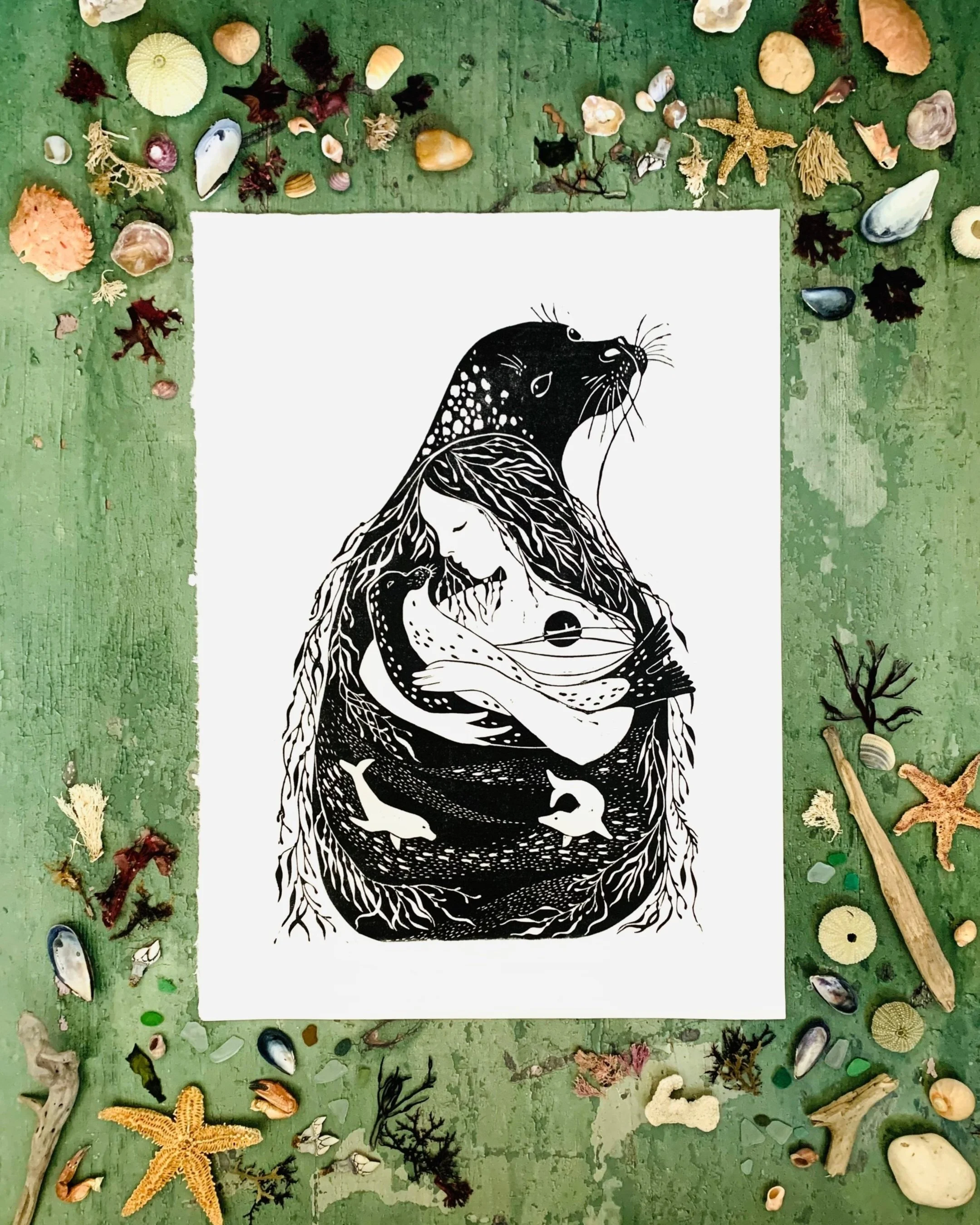 A handcrafted linocut print inspired by the folktale of Selkie.