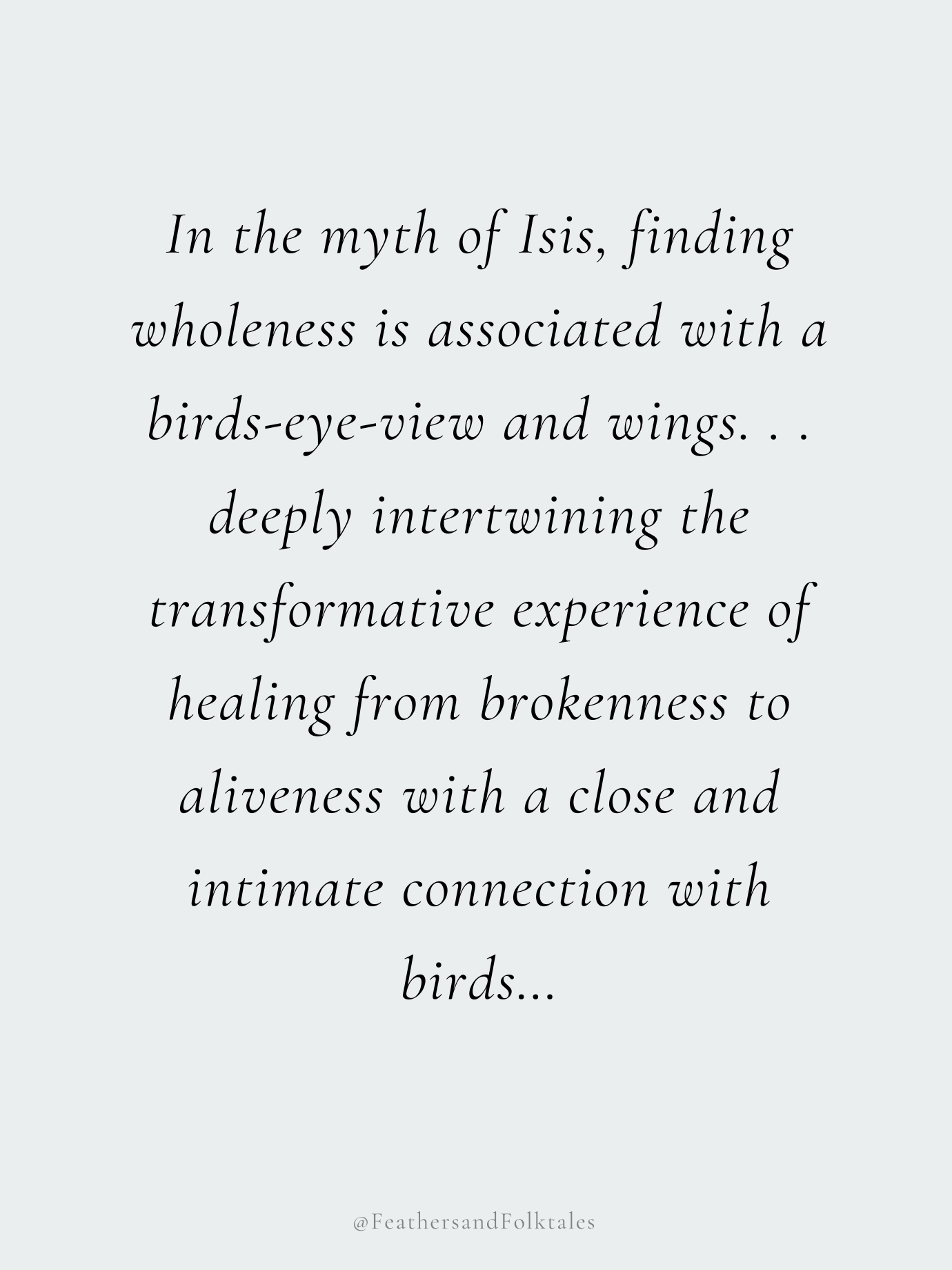 Kites were also thought to be the ones ferrying Osiris to the Otherworld and the idea that birds mediate between different worlds is a very persistent theme in many folktales and myths around the world including Makers of Dreams and Linnunraata. This capacity to mediate between the world of the living and the world of the dead is what Dr Clarissa Pinkola Estes, Jungian Analyst, describes as a double archetype, also known as the Creation Mother and Death Mother. This double archetype shows up often in folktales like Baba Yaga, Weaver of the World and Mother Goose. The Creation Mother and Death Mother holds the tension between what is dissolving and what is emerging, and sees the potential for the wholeness and renewal in the broken dying parts, which is a form of heightened awareness. . .In fact, in mythology wings can symbolize spiritual flight — an ascent to the heavens, and heightened consciousness. What I find fascinating is that the Goddess Isis embodies this dual consciousness through her capacity for flight, and her life-giving bird-like wings, once again showing how harnessing and embodying bird-like wisdom can empower our capacity for transformation.