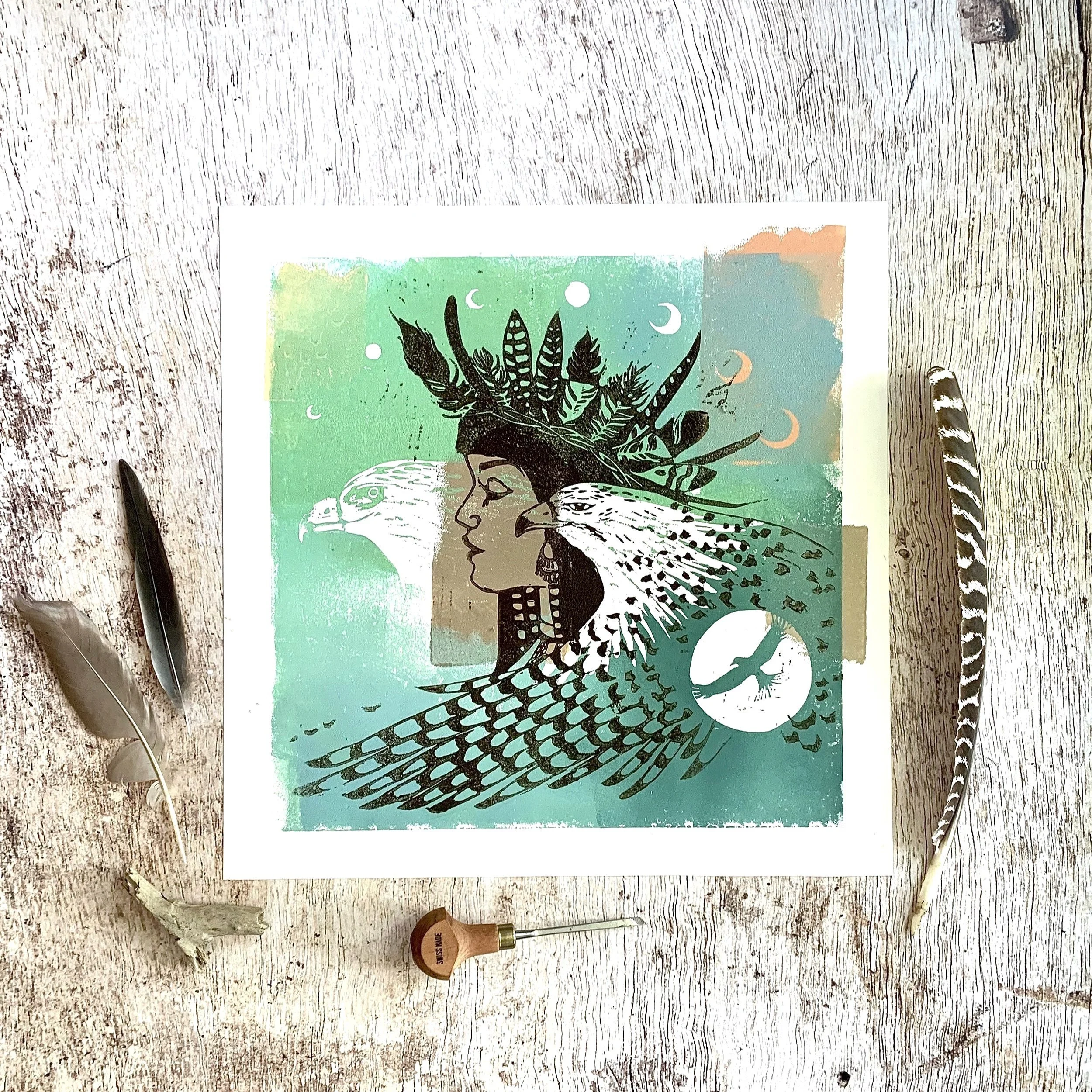A multi block linocut print inspired by the Goddess Isis including: kestrel birds, layered colors inspired by similar layers of colors of the Sycamore tree bark. Isis is characterized as both a moon and sun goddess, a cosmic goddess governing time and the seasons which, in turn, guaranteed the fertility of the earth.