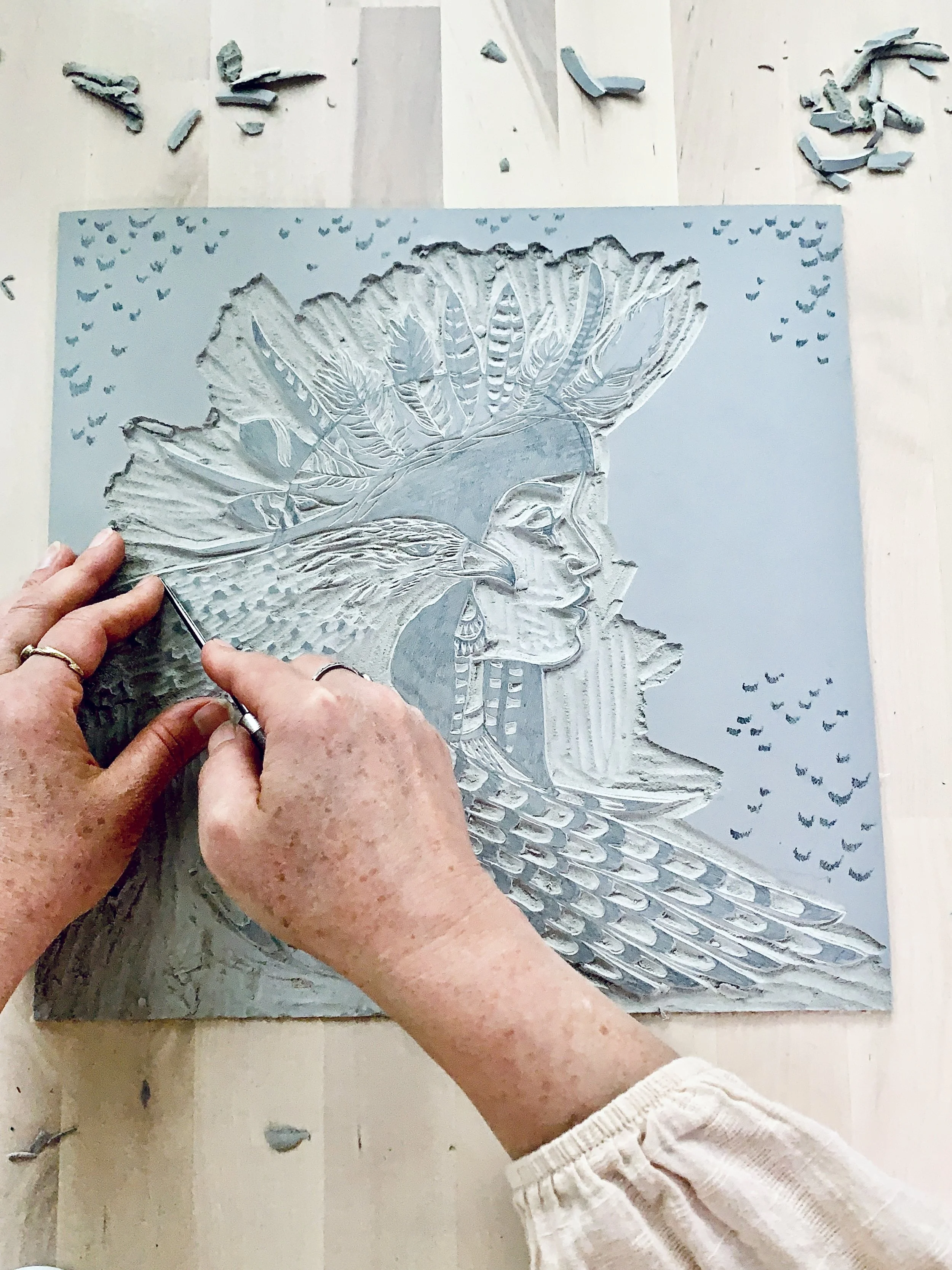 Starting to carve a multi-block linocut of the Goddess Isis and the falcon (kestrel) with whom she is associated.