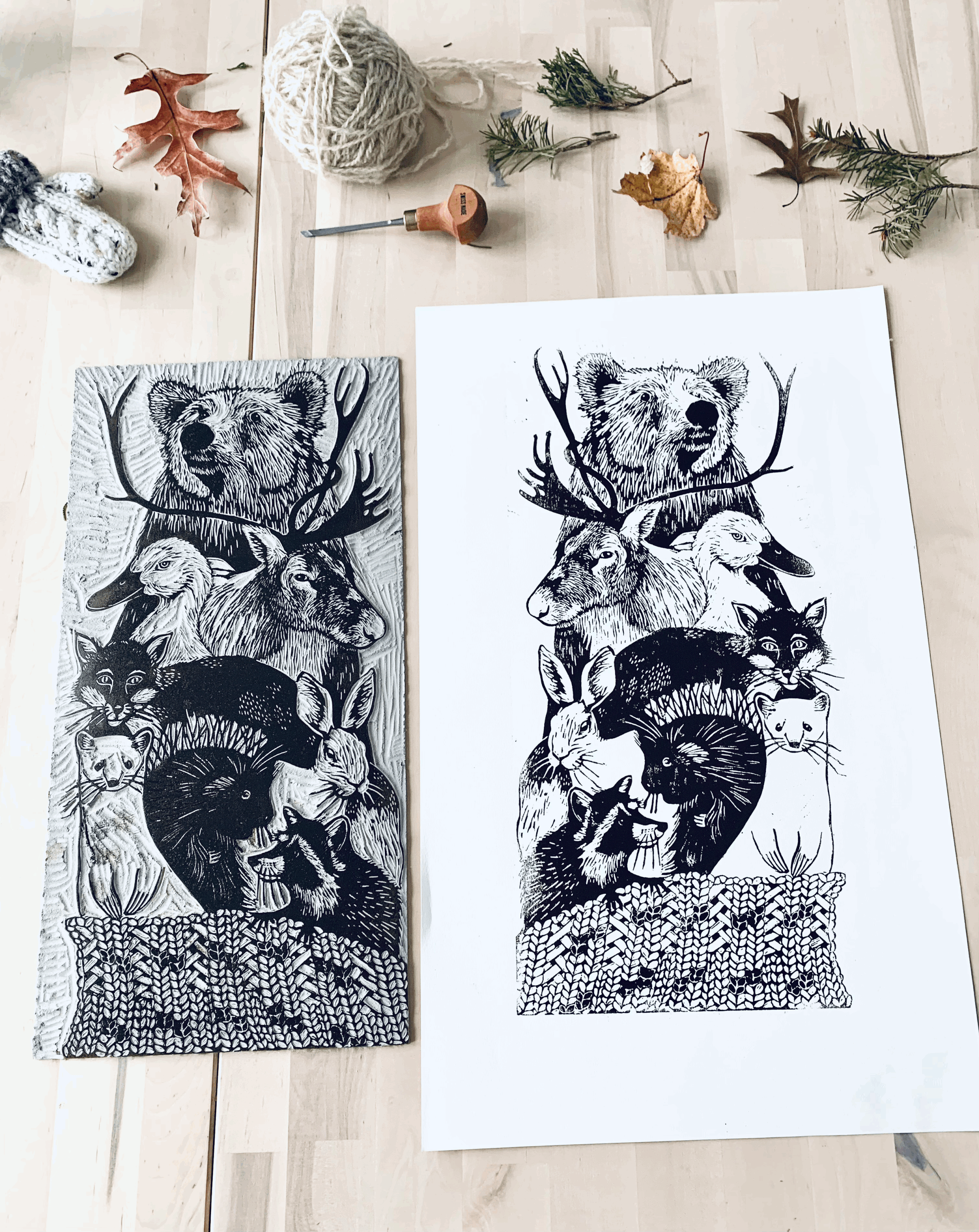 This is a handmade linocut print featuring woodland animals inspired by a folktale from Ukraine, retold by beloved children’s book author Jan Brett in her book The Mitten. The artwork includes various woodland animals: a bear, elk, duck, fox, marten, porcupine, rabbit and raccoon all trying to fit inside a mitten!