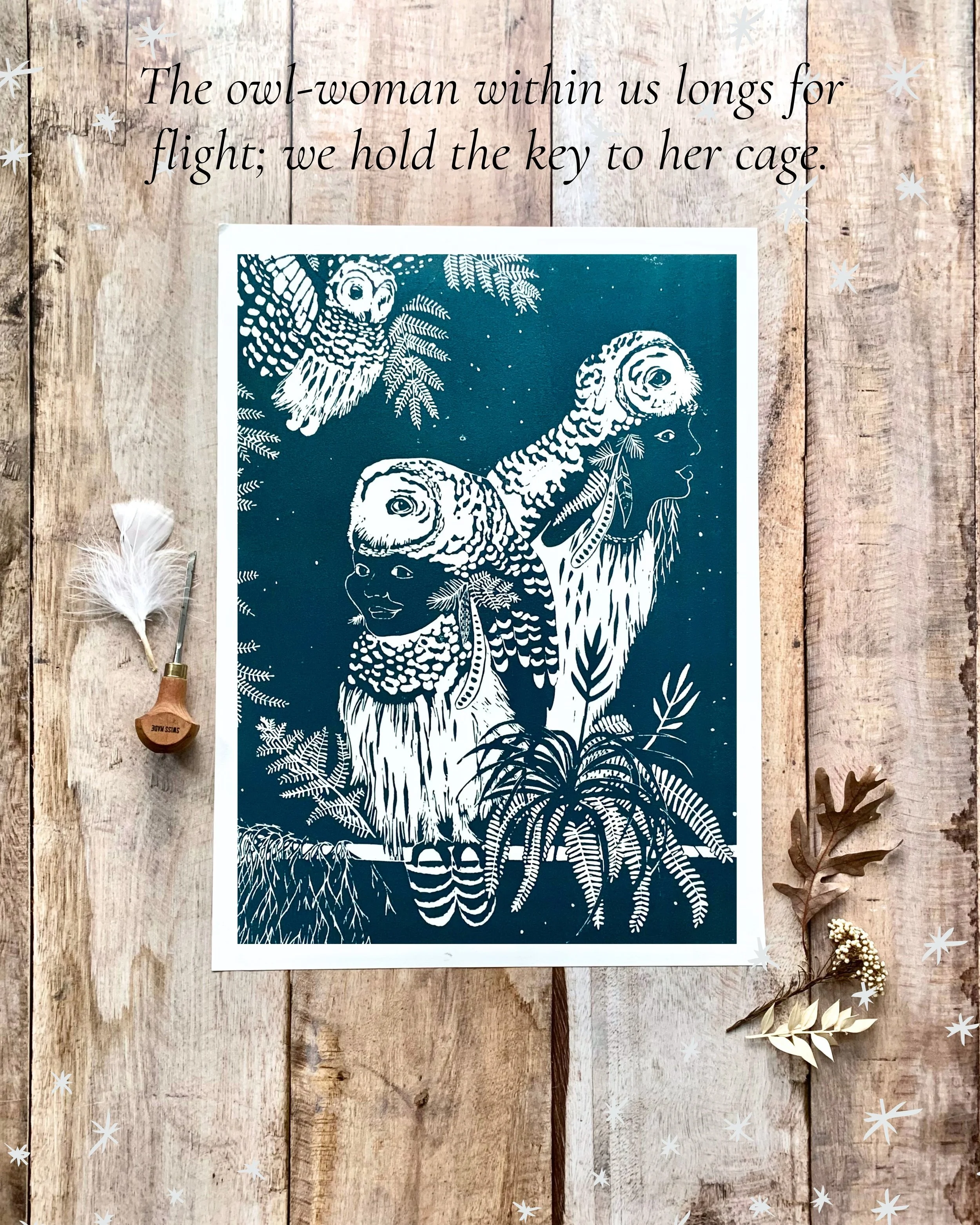 Harriet Tubman also spoke the language of owls. Cloaked in darkness and guided by stars, she would call out with the haunting cry of the barred owl—a wild, echoing sound that told fugitives hiding in the shadows it was safe to move. The owl’s call was both camouflage and compass, allowing her to slip past danger and lead others toward the trembling light of freedom. Like the owl, she moved with instinct, with knowing, with the power of a woman who belongs to the wilderness. In the telling of this African American folktale—passed mouth to ear in hidden cabins and along secret routes—the barred owl becomes more than a bird: she becomes the voice of liberation, the keeper of the wild soul, the sign that a woman has remembered who she truly is. As Clarissa Pinkola Estés reminds us, “Go out into the woods, go out. If you don’t go out in the woods, nothing will ever happen and your life will never begin.”