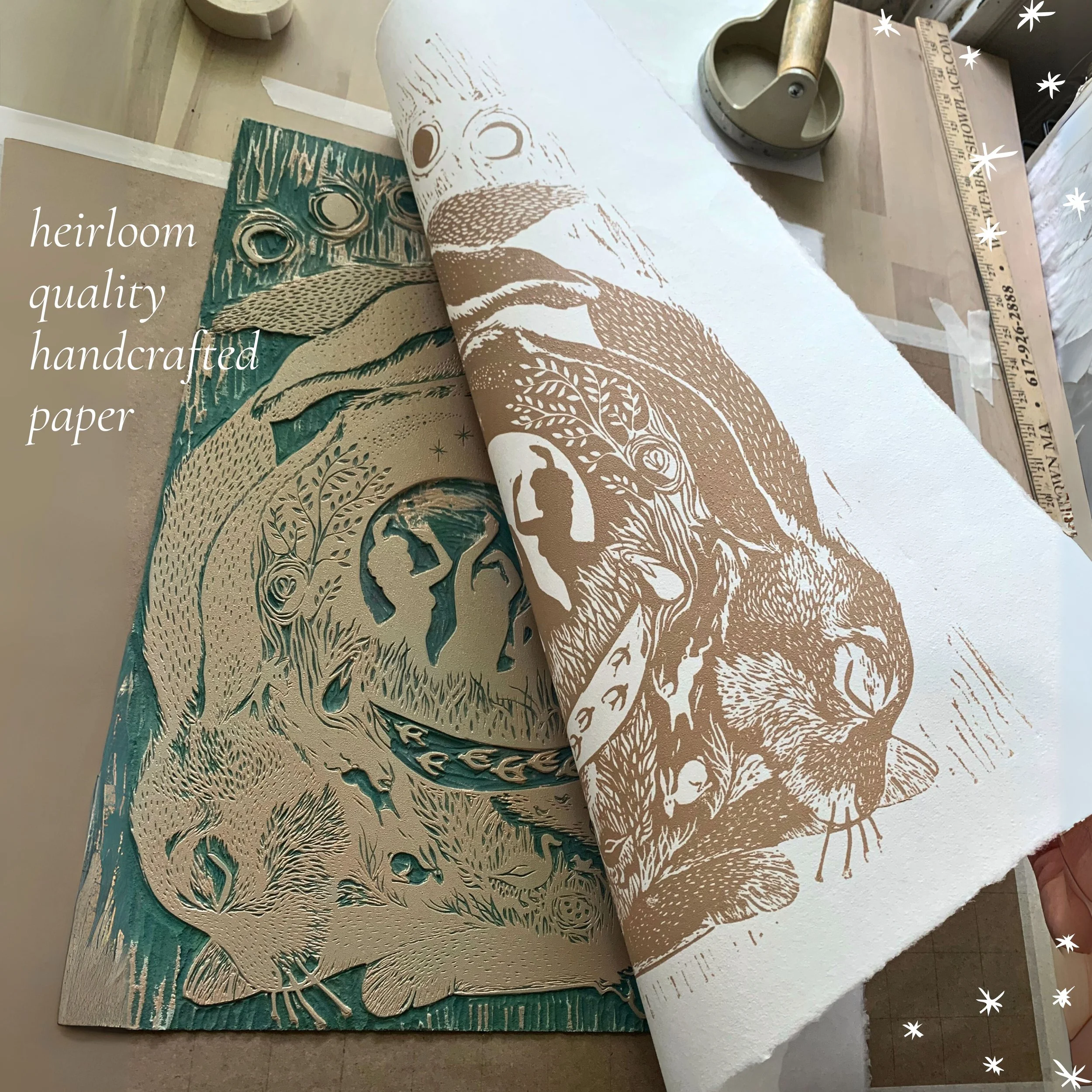 At FeathersandFolktales, many prints are made on Strathmore and Stonehenge papers—archival-quality materials that balance fine art integrity with environmental consciousness. Strathmore, a bright white, smooth 100% cotton paper produced locally in Massachusetts, offers crisp detail and a modern feel. Stonehenge, a U.S. made, heavyweight cotton-based paper made with alternative energy and salvaged plant fibers, is EMS-certified and tree-free—offering an eco-conscious foundation for work rooted in storytelling, nature, and timeless craft. Both these papers are sustainable choices for U.S.-based collectors.