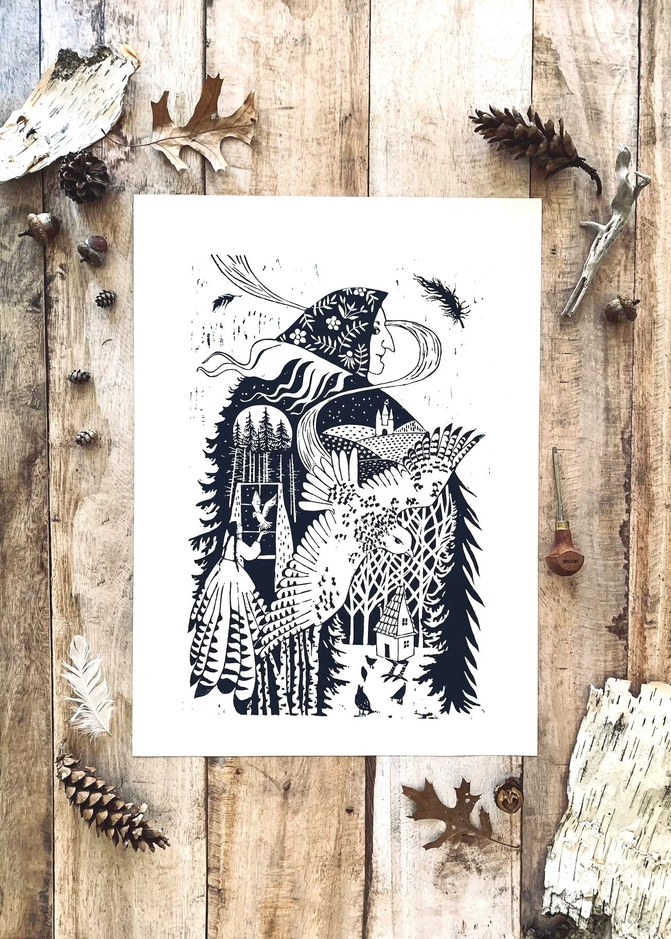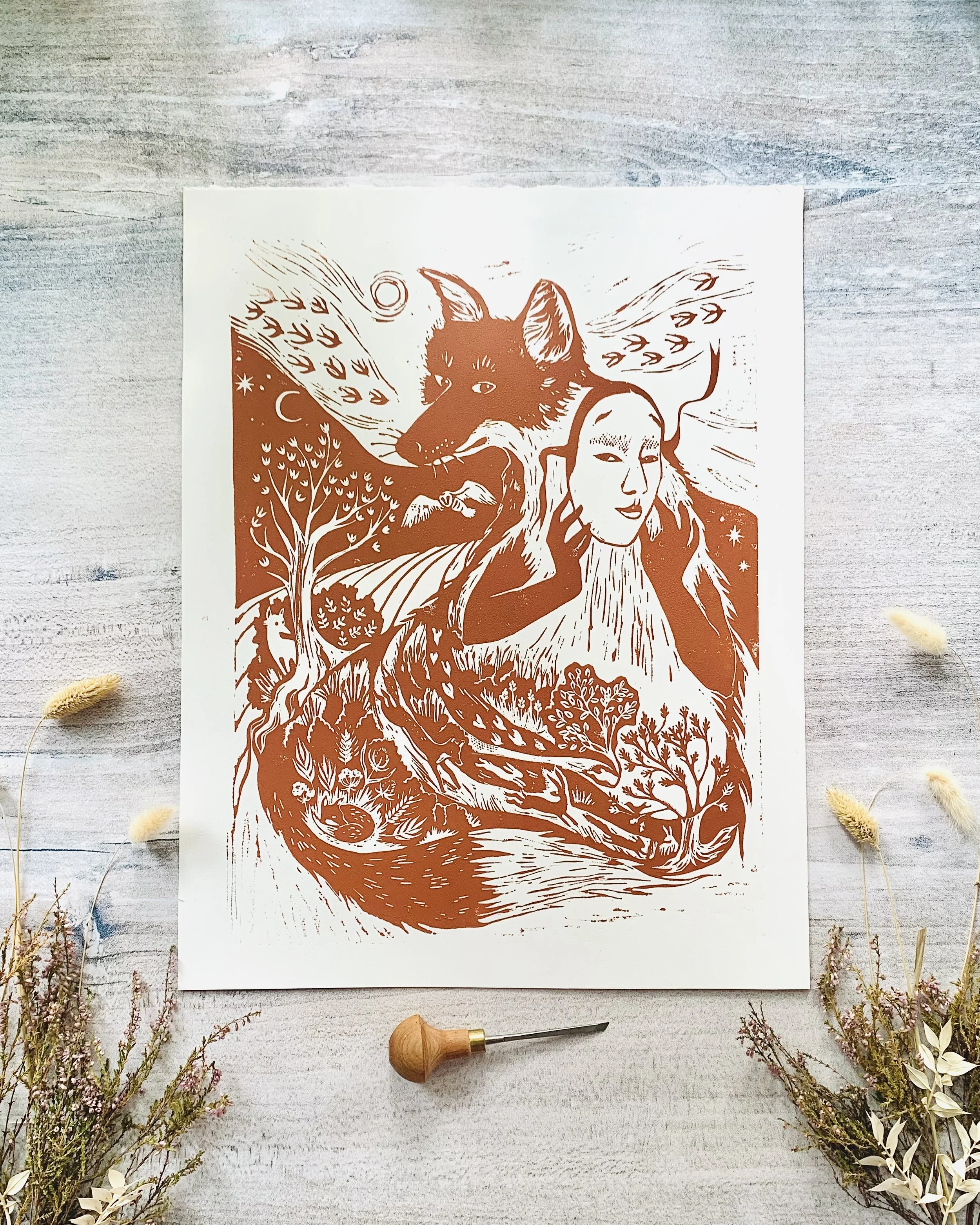 Select prints are also made on Arnhem 1618®—a 100% cotton, acid-free printmaking paper crafted by the historic Schut Papier mill in the Netherlands, in operation since 1618. With its softly textured vellum finish, substantial weight, and natural deckled edges, Arnhem offers a beautiful balance of modern performance and centuries-old craftsmanship, enhancing the depth and clarity of linocut work with quiet elegance..