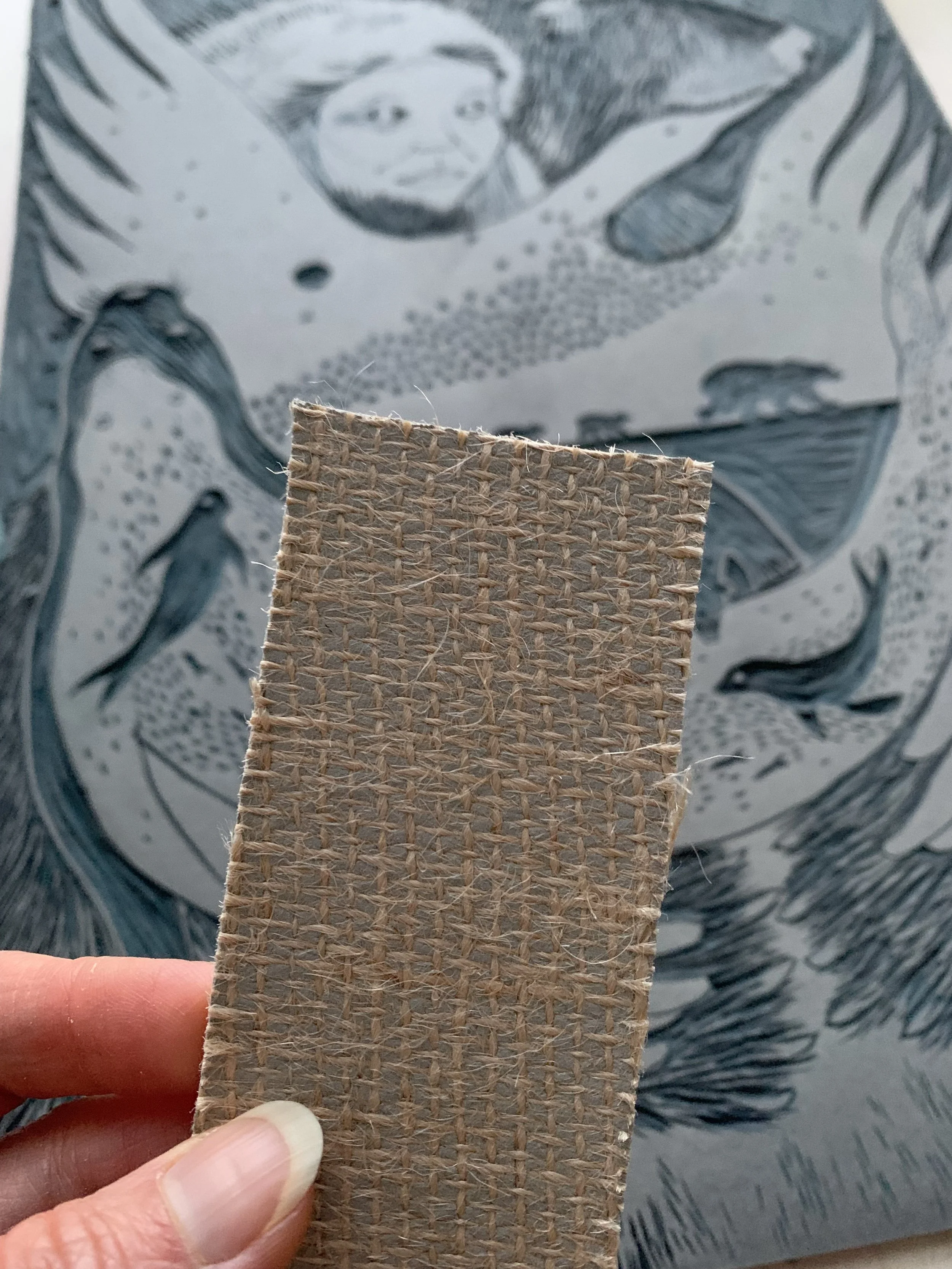 One of the most beautifully symbolic aspects of linoleum is its woven jute backing—a “weaving” that serves as the archetypal feminine foundation for transformation. Even the word linoleum carries echoes of this layered, fibrous ancestry: coined in 1860 by English inventor Frederick Walton, it combines the Latin linum (“flax,” source of linseed oil) and oleum (“oil”), while its root linum also connects linguistically to the English words “line” and “linen”—threads, cords, and marks stretched across space. In alchemy, weaving imagery evokes the matrix, the vessel (vas), the holding environment, the body that receives and supports spirit. In lino, the jute performs this same function: it is the womb-like ground that holds the transformed material, while the lino compound becomes the skin or surface, and carving reveals form emerging through this supportive weave.