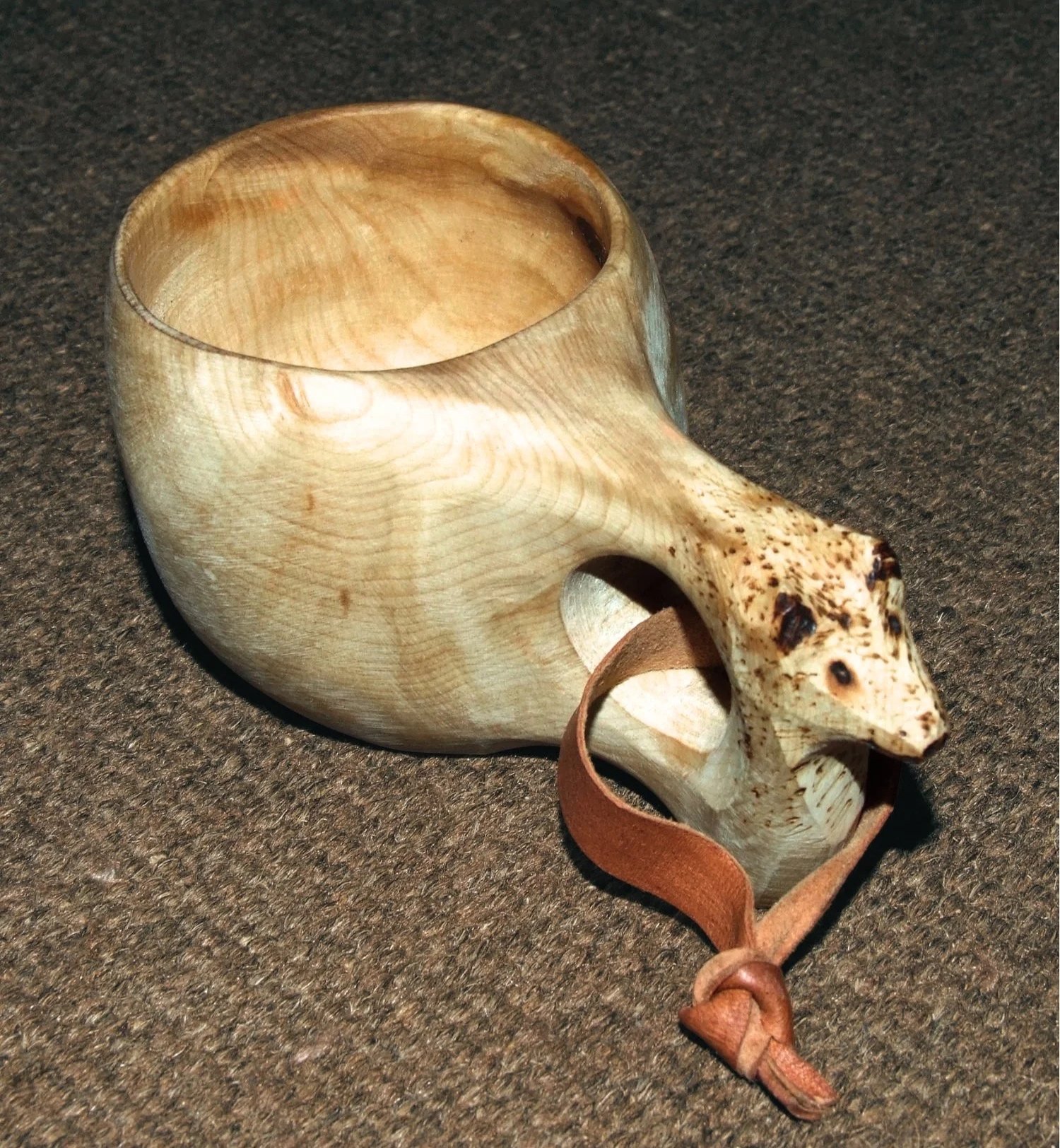 Carved Swedish kuksa - wooden cups carved from the burls of trees such as birches. Carvers intentionally embrace the irregularities of the wood - knots, twists and swirls - to give each cup a unique living character. Retrieved from Wikimedia Commons Jan 24. 2026.