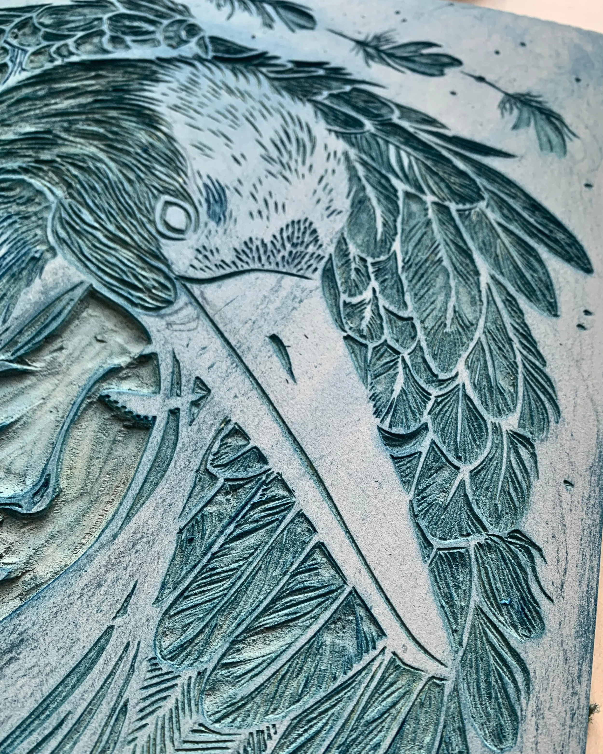 Details of a carved block of artist’s linoleum